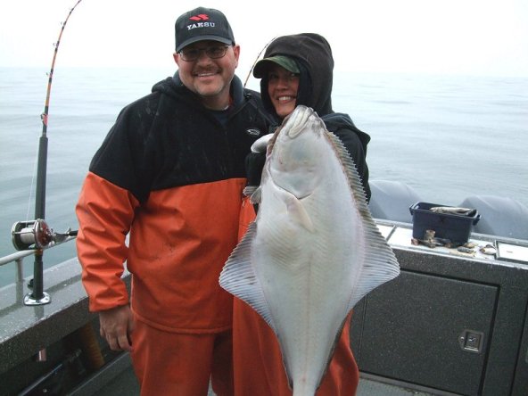 The evidence is below. Not fly fishing, to be sure, and even though the deckhand is behind a decent halibut and attired in unflattering foul-weather gear, most comments about this photo weren’t about the fish, but about much she was leaning in, her smile, etc.