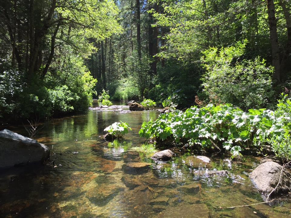 I turn down one with a sign pointing to Lower Deadman Creek Campground. It’s about two miles before the turn into a small basin that contains the campground and the creek. Here the chaparral gives way to pines. The campground straddles the creek; four of its thirty sites are occupied, but the abundance of water this year makes half the sites unusable.