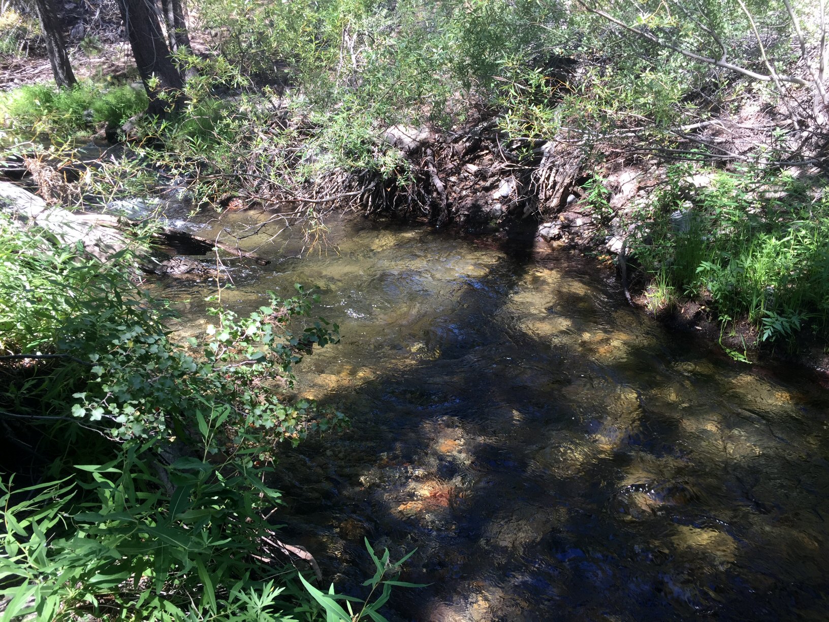 I’m here looking for the wild trout that are rumored to be in the upper reaches of Deadman Creek, but I can’t help warming up my casting arm tossing my flies to a few of the human-raised rainbows. My cast is rusty but good enough to lay my flies down on a seam that carries it over a few fish fighting for position in the current. There’s no subtlety about the stocked trout. The lead fish slashes at my dry fly and the other fish scatter. The skunk is off.